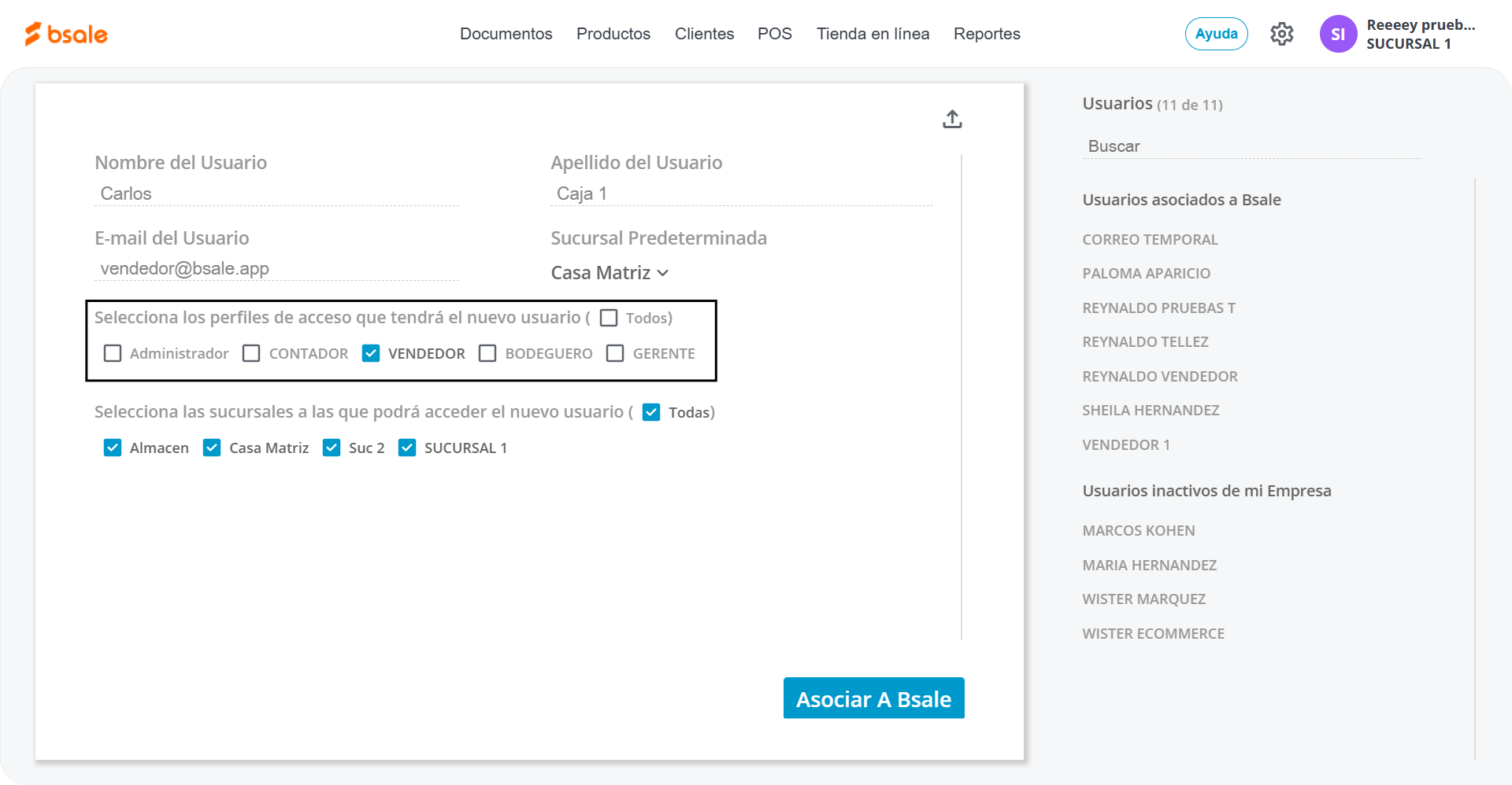 Finalmente, presionamos en el botón Asociar a Bsale. El sistema le enviará al usuario un correo de invitación a utilizar la plataforma, el usuario debe abrir su correo y seguir los pasos para crear su contraseña.