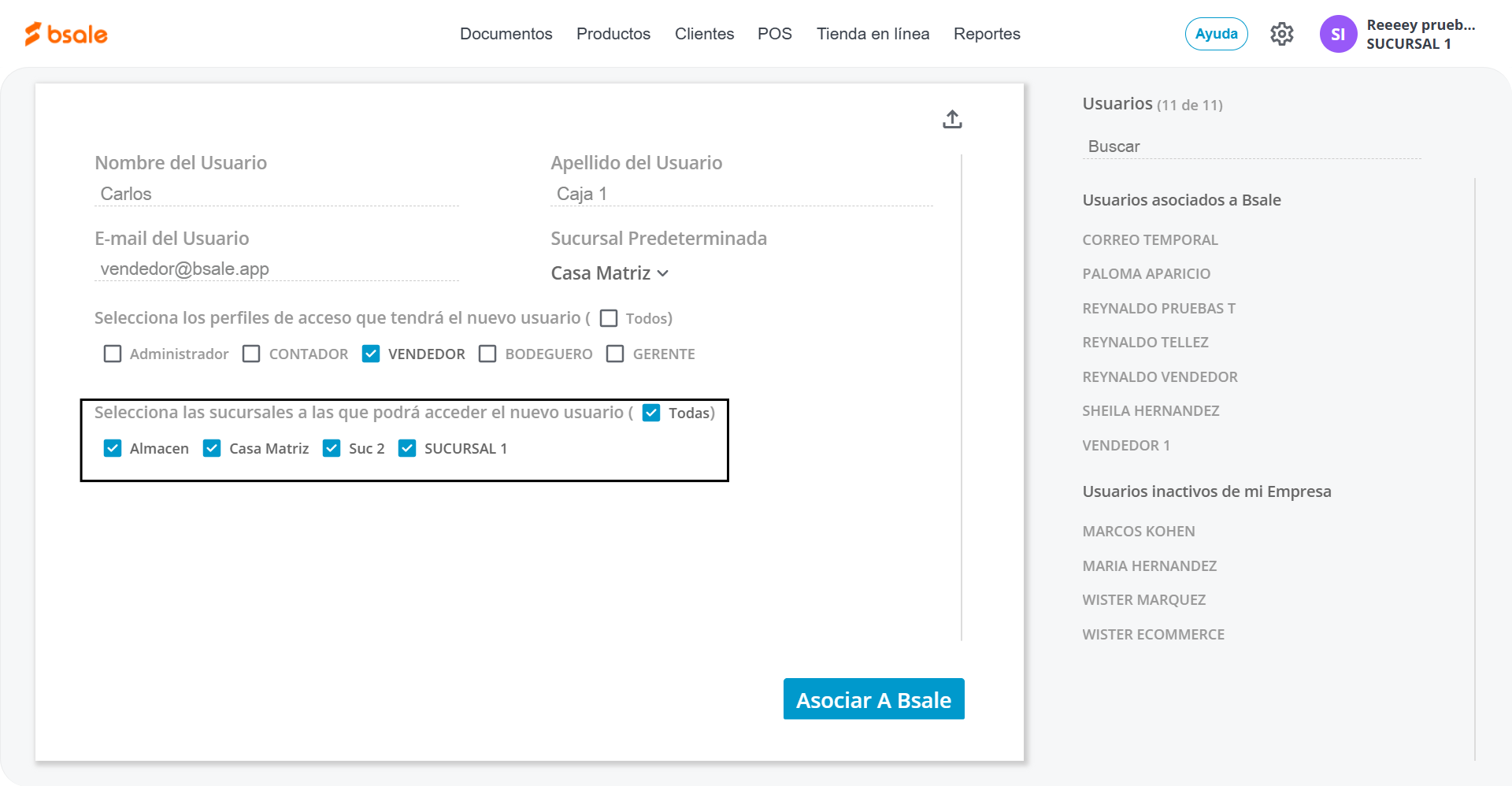 En caso de tener sucursales adicionales, podrás definir a cuáles tendrá acceso y cuál será la sucursal por defecto del usuario cada vez que inicie su sesión en Bsale. Si no tienes sucursales, estas opciones no se mostrarán.
