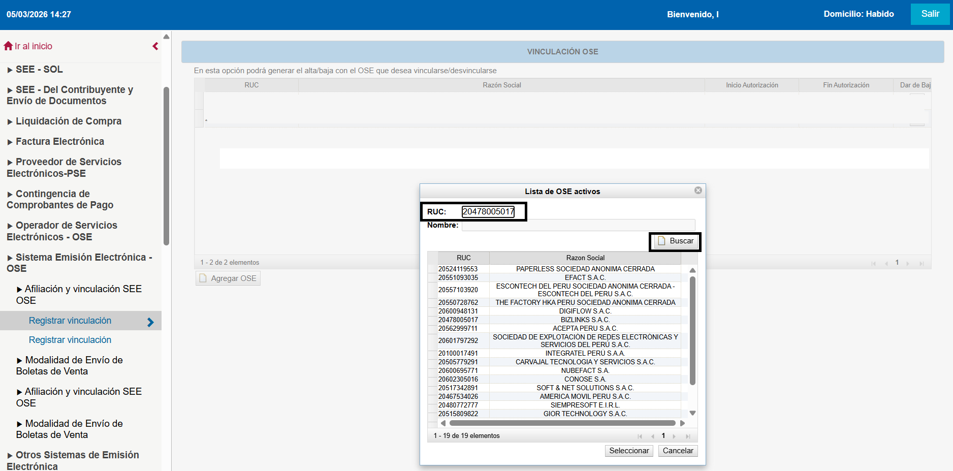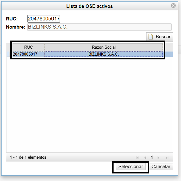 En la lista de abajo te aparecerá el RUC y la razón social de Bizlinks, asegúrate que queden marcados en azul y le das a Seleccionar.
