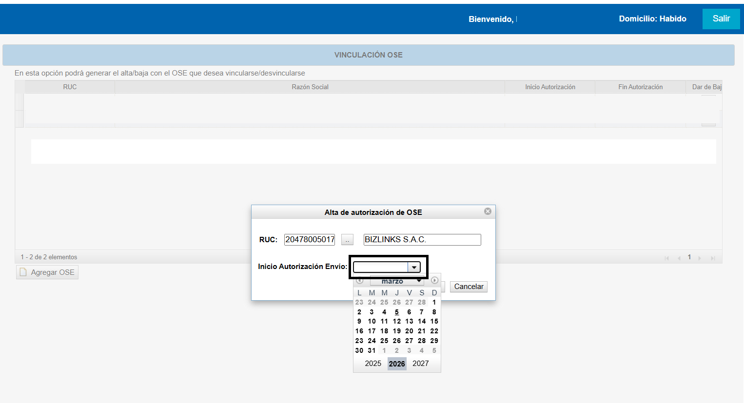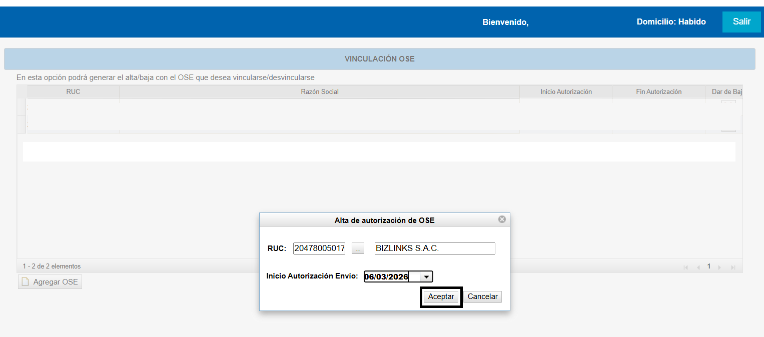 Si todo va bien, te aparecerá registrado Bizlinks en la pantalla inicial de Vinculación OSE.