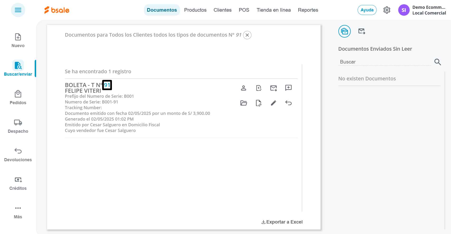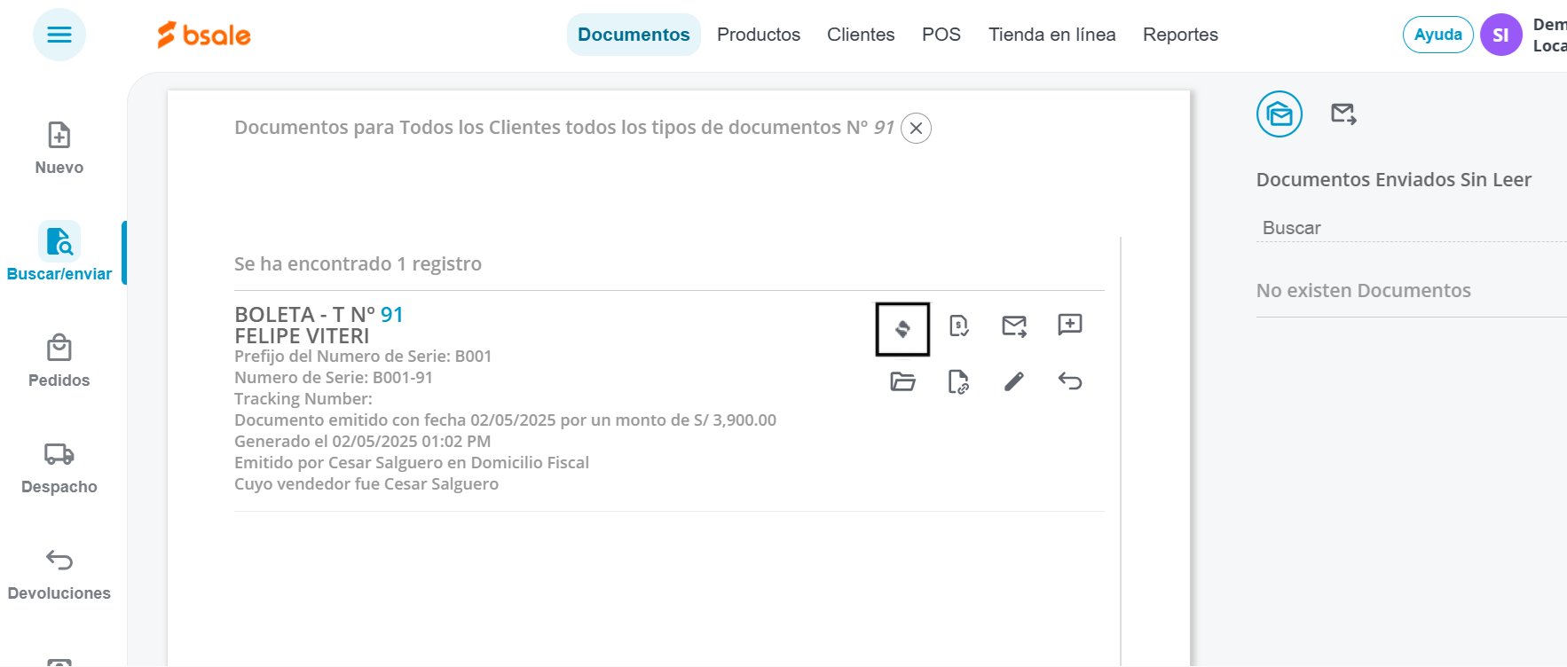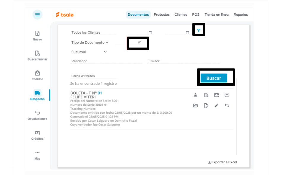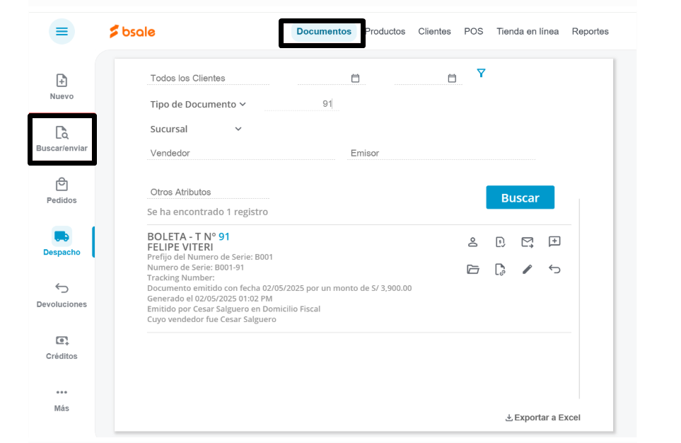 Ahora podrás buscar el documento. Tendrás opción de hacerlo por cliente o por fecha incluso puedes escribir el número de documento que necesitas. Ahora haz clic en Buscar.
