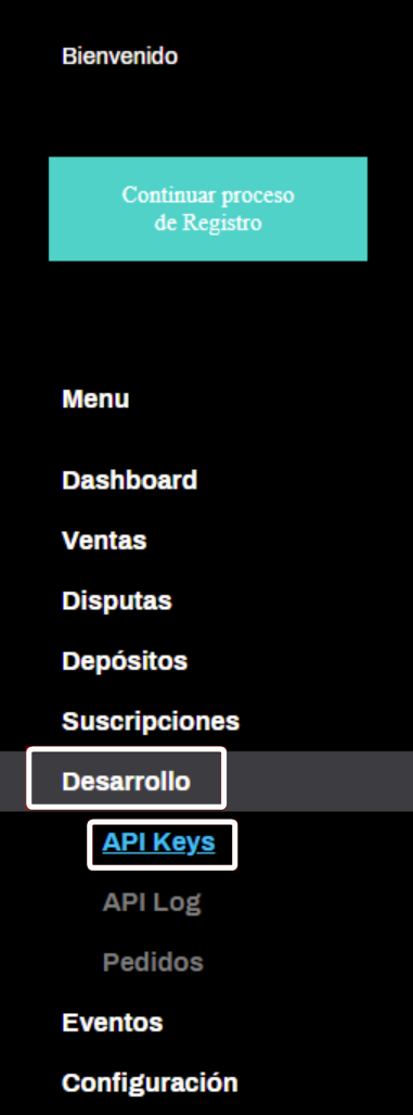 Ve al menú lateral izquierdo del panel de Culqi, haz clic en Desarrollo y luego en API Keys