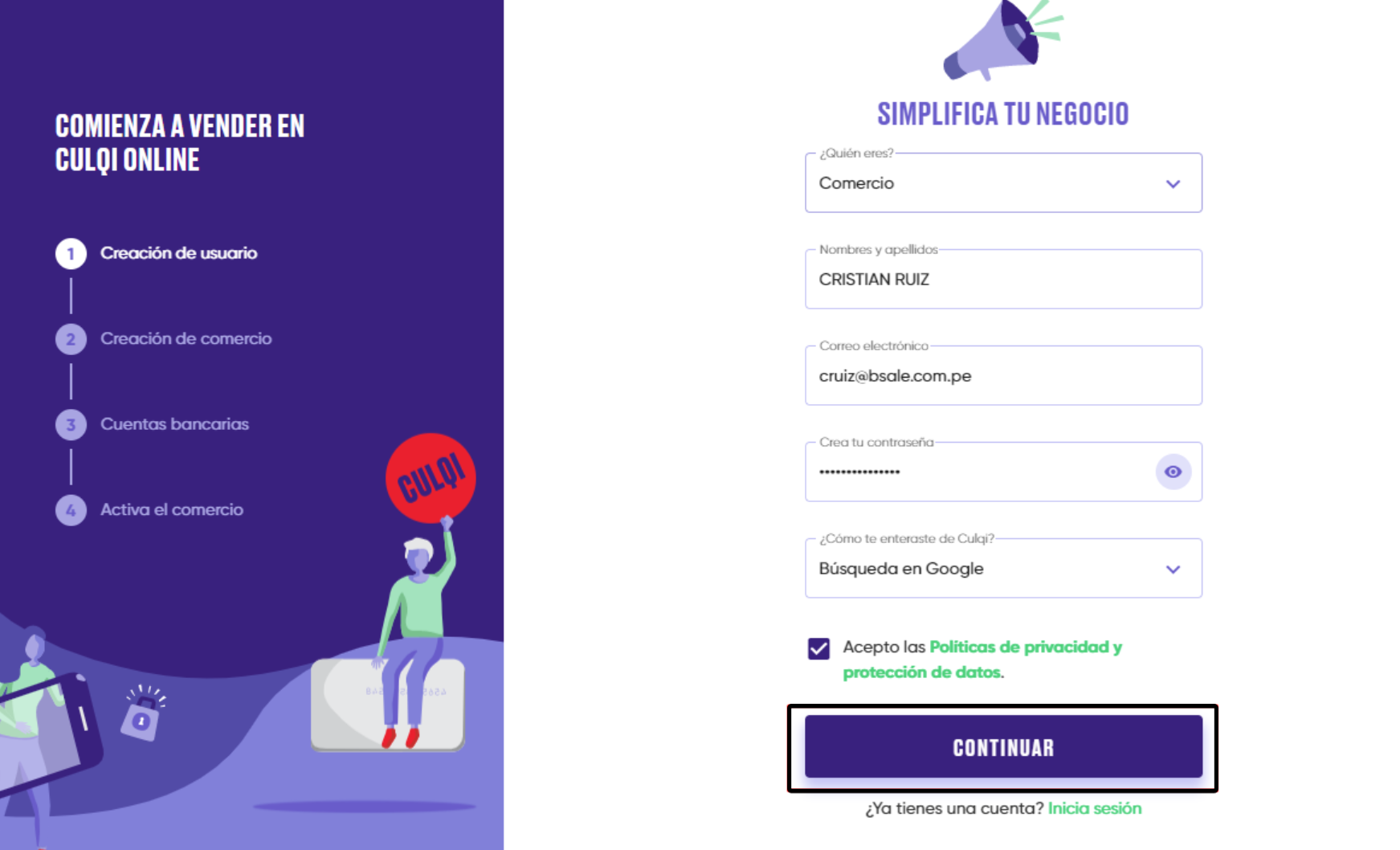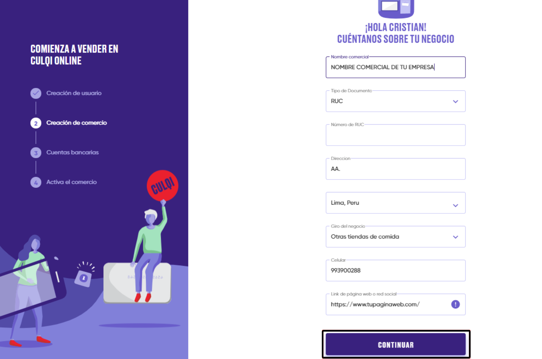 Continúa completando los datos de tu empresa requeridos por Culqi: