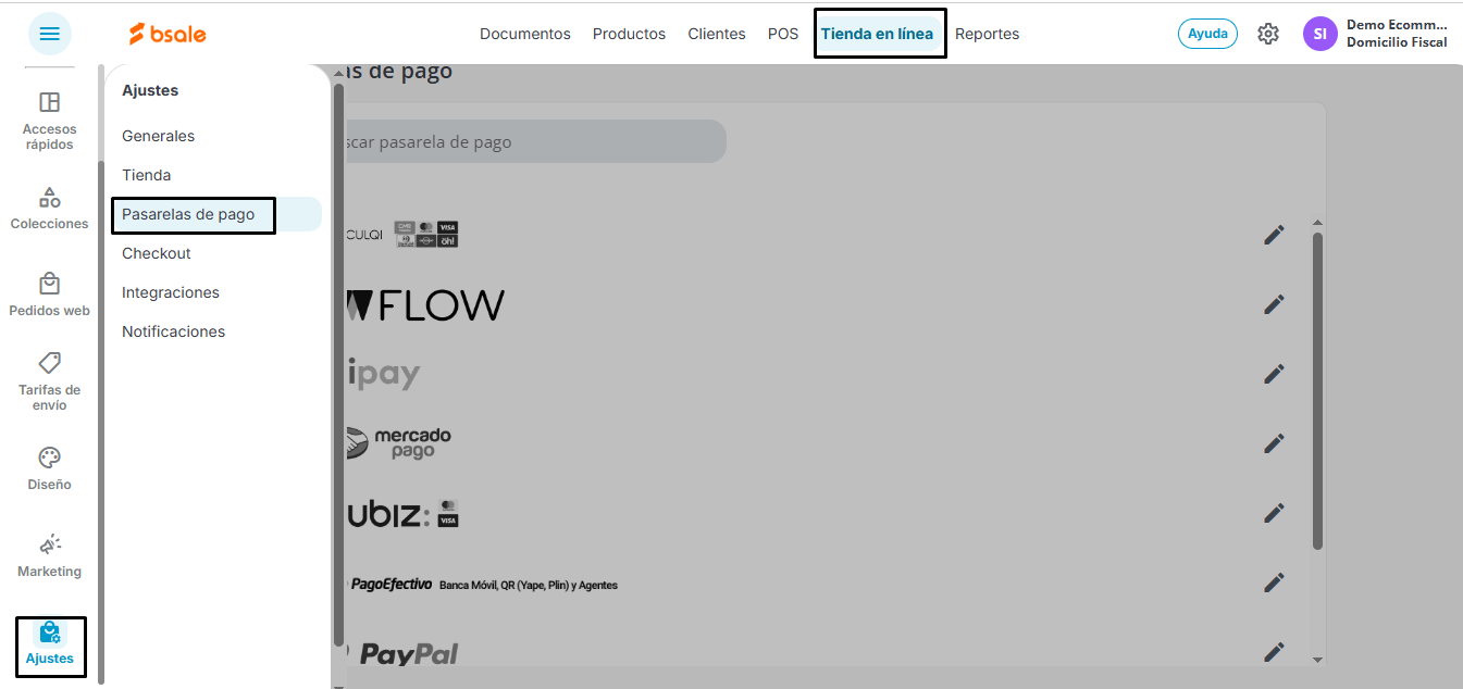 5. Ahora ingresa a Bsale y sigue los siguientes pasos para configurar el medio de pago: ingresa a Tienda en línea luego en Ajustes y finalmente, entra en Pasarelas de pago.