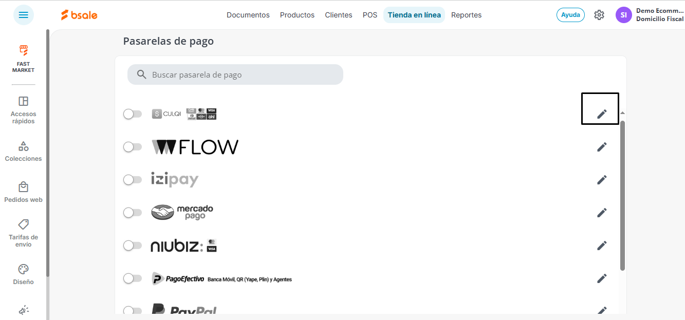 Haz clic ahora en el lápiz para editar el medio de pago de Culqi.