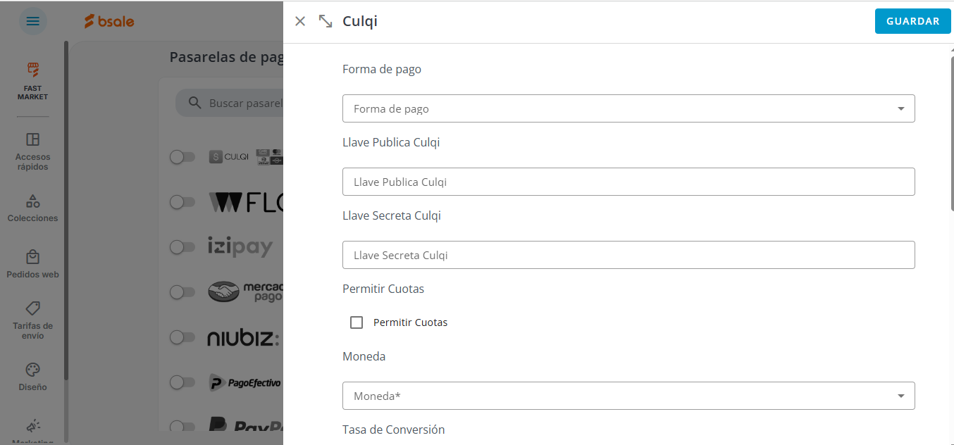 - Llave Pública Culqi: escribe la Llave pública que obtuviste en la plataforma de Culqi.