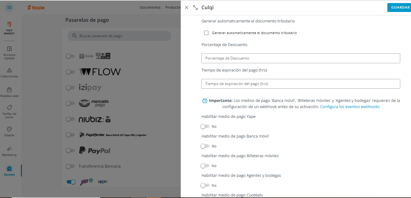 Ahora solo resta Guardar las configuraciones y dejar activo el botón de activación al lado izquierdo del medio de pago.