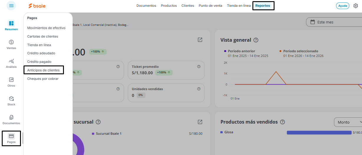 Si deseas ver los abonos a favor de tus clientes, ve a Reportes, haces clic en el sub menú Pagos y luego en Abonos de clientes.