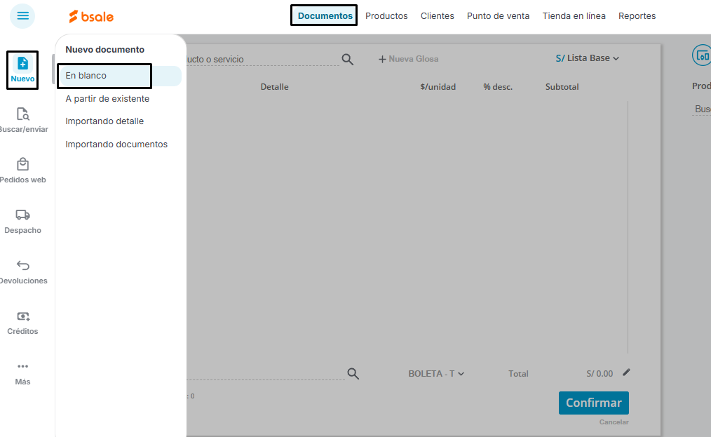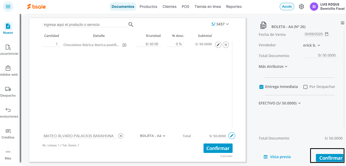 En la parte inferior de la pantalla selecciona el tipo de documento de venta. Para este caso, usaremos Boleta.