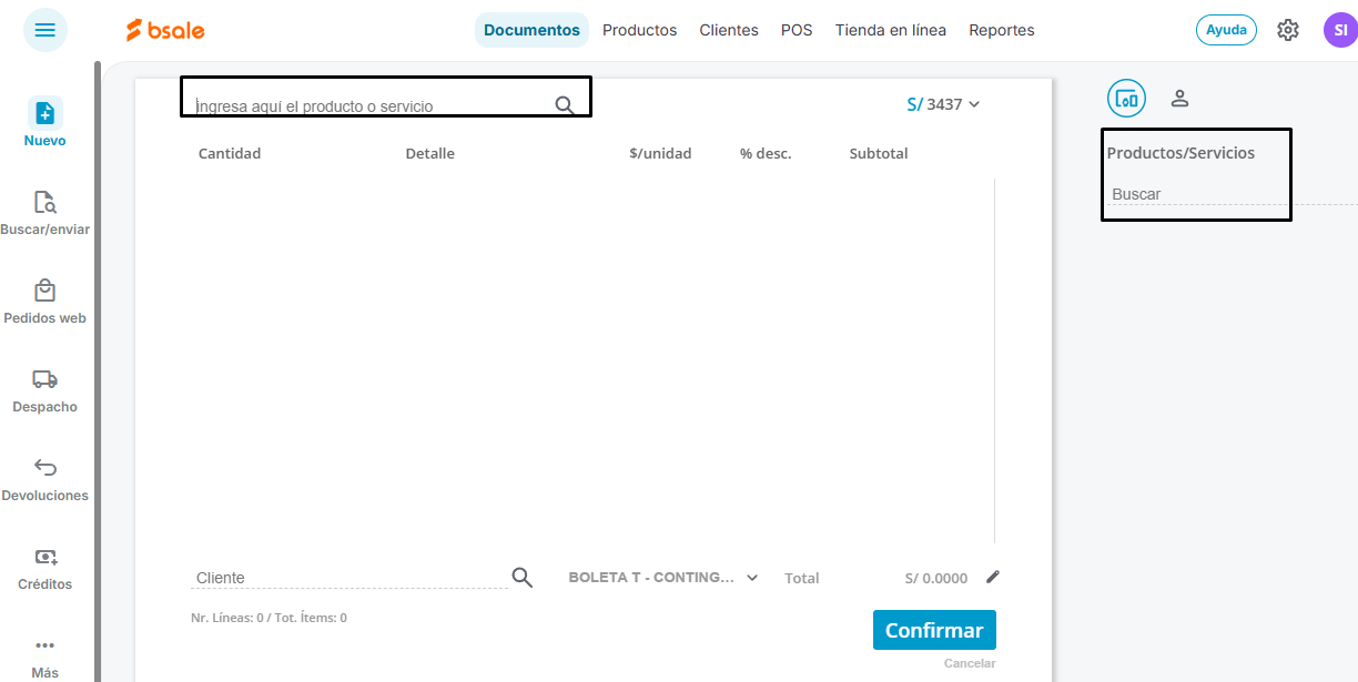 A la izquierda podrás ver el detalle de cada producto ingresado. Tienes oportunidad de modificar las cantidades a vender y Bsale calculará el total de forma automática.