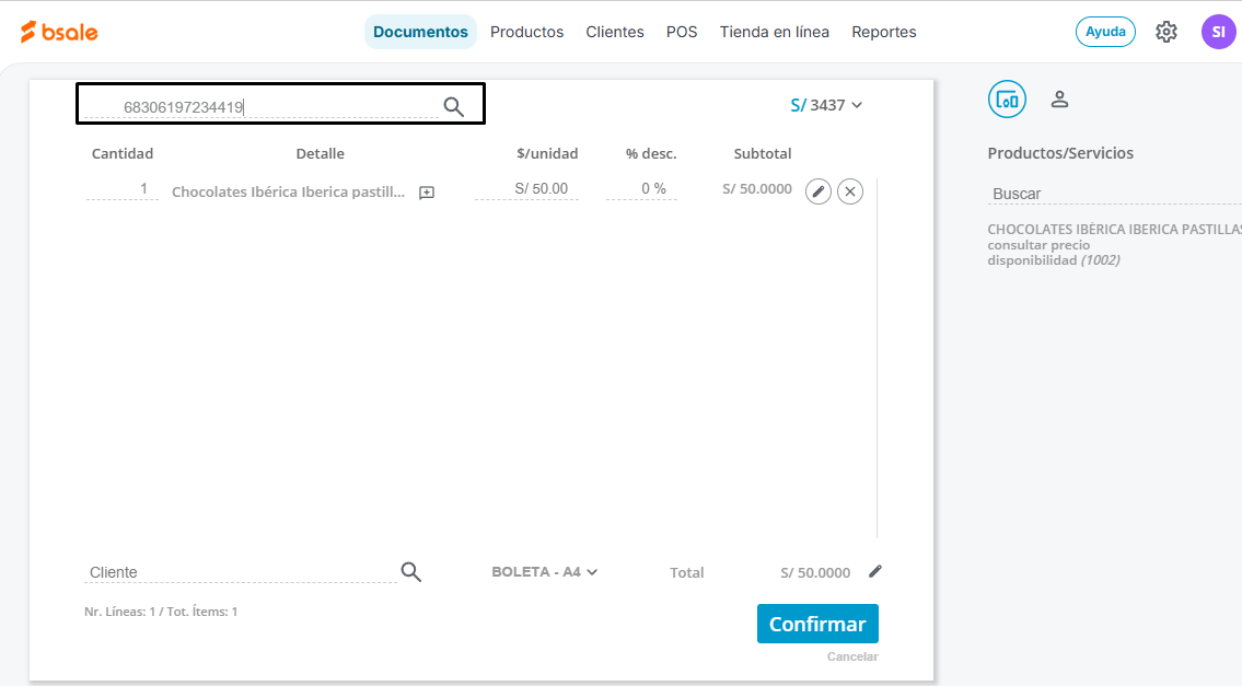 Podemos buscar escribiendo el nombre del producto, tipo de producto o servicio, SKU o el código de barras. El resultado de búsqueda se mostrará a la derecha de la pantalla.
