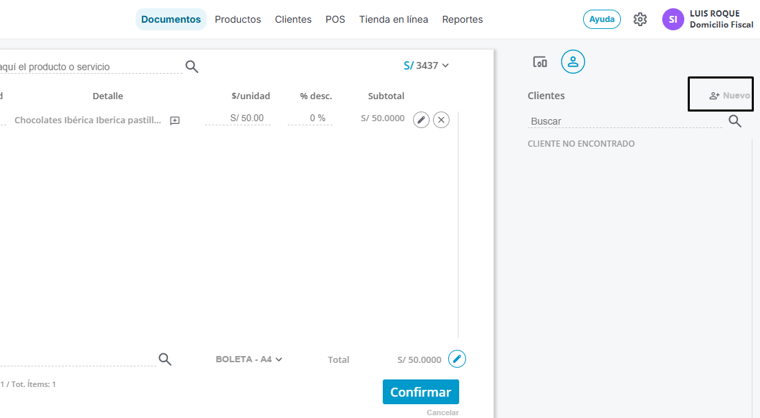 Si al buscar el cliente el sistema te indica cliente no encontrado. Podrás crearlo haciendo clic en la opción Nuevo.