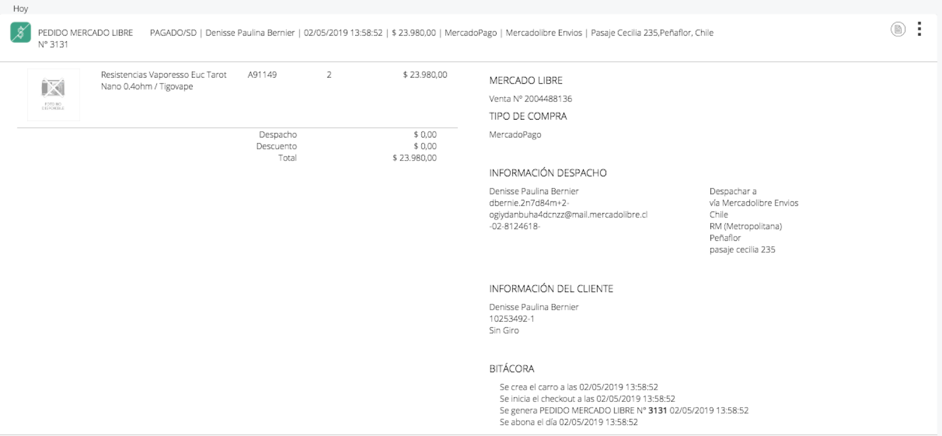 Este proceso es únicamente para gestión interna y salida del producto en Bsale. Todo el proceso 'real' de entrega al cliente, costos, medios, etc. se ve directamente con Mercado Libre.