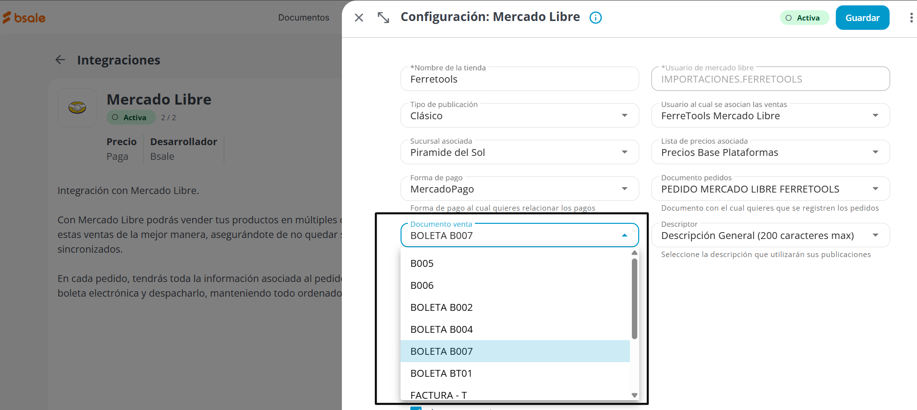 Desde el momento que la integración queda operativa, cualquier pedido que llegue a través de Mercado Libre, podrá ser gestionado por Bsale para efectos de emisión de Boleta o Factura, según corresponda.