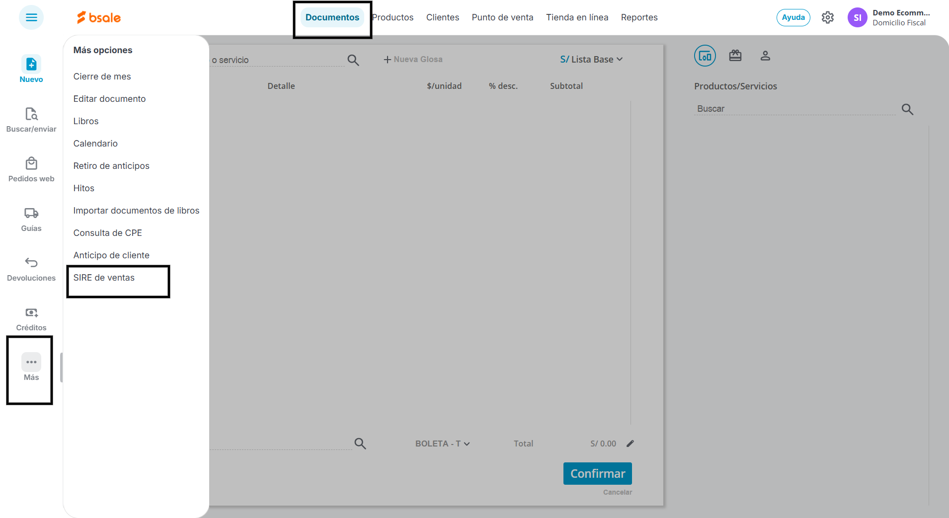 Para ingresar al módulo SIRE de ventas ingresar en Documentos presionar en Más opciones y luego hacer clic en SIRE de ventas.