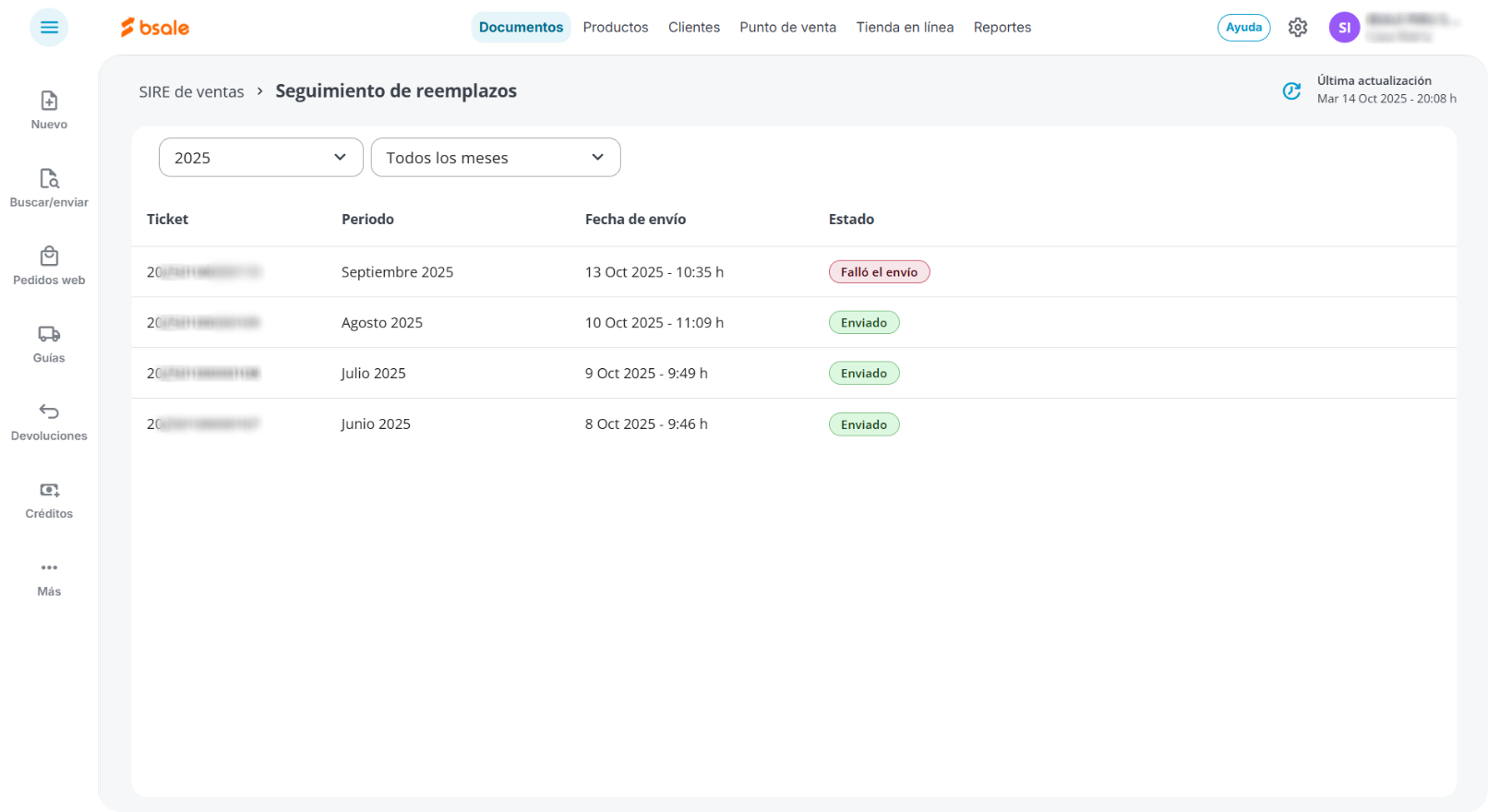 En esta pantalla verás todos los reemplazos que realizaste desde Bsale y el estado en el que se encuentran en la SUNAT. Cada vez que envíes un reemplazo de propuesta, se generará automáticamente un ticket de seguimiento que será visible aquí una vez que la SUNAT devuelva una respuesta.
