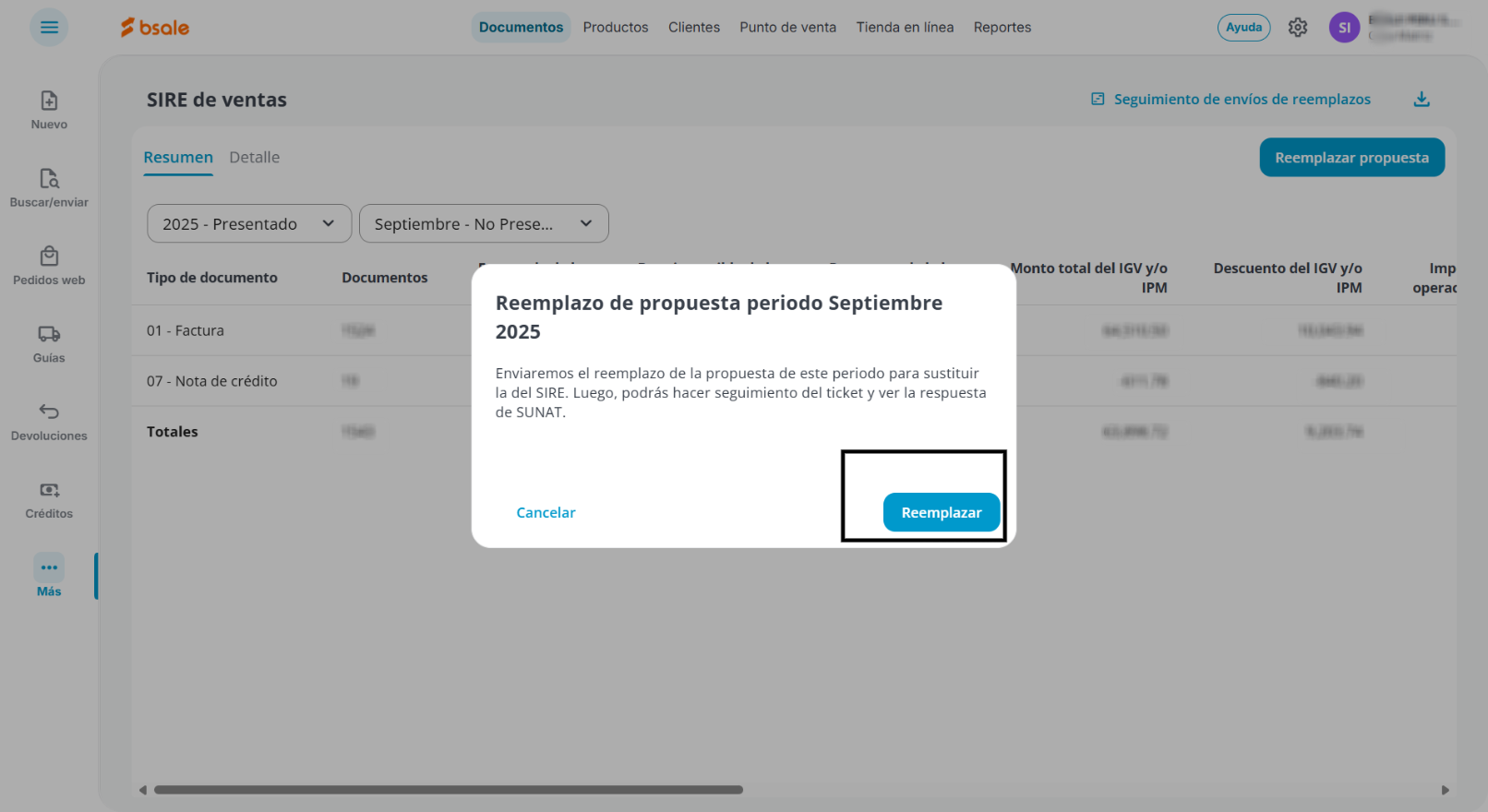 - Si ya tienes un preliminar cargado en la plataforma de la SUNAT (Superintendencia Nacional de Aduanas y de Administración Tributaria) para ese periodo, debes eliminarlo antes de enviar el reemplazo de la propuesta desde Bsale.