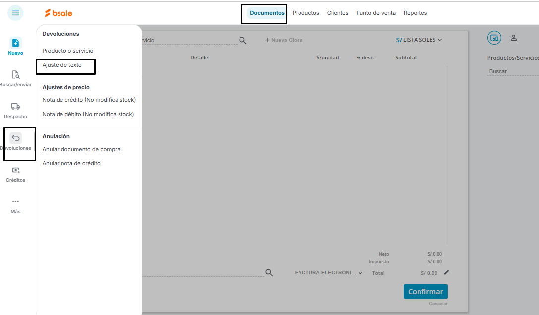 Ingresar al módulo de documentos, luego seleccionar Devoluciones y presionar Ajuste de texto