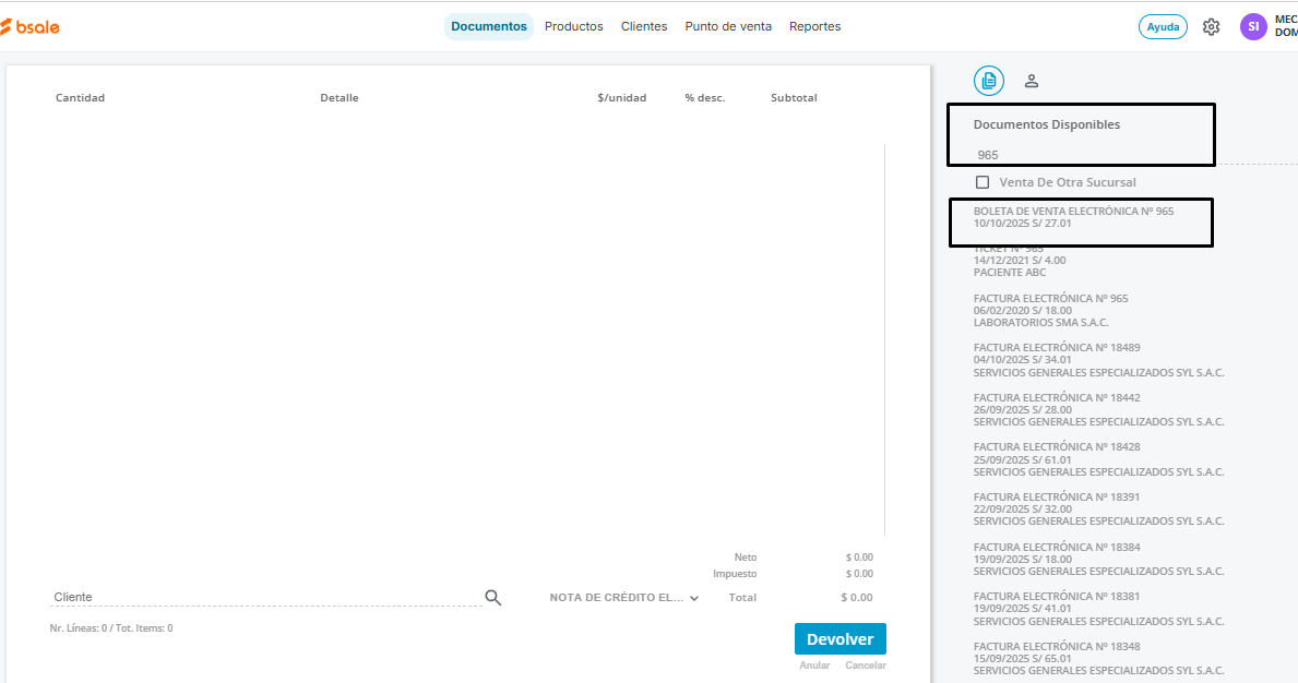 En el buscador debes Ingresar el número de la factura o documento que quieres corregir. Seleccionas el documento de la lista de la izquierda y presionas devolver.