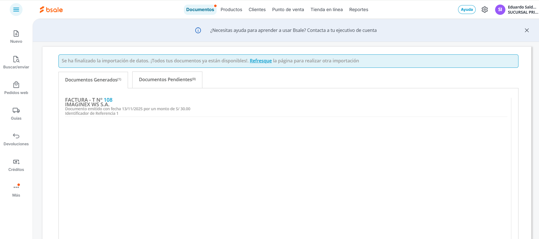 Aparecerá un mensaje de BSALE que indica que se están generando los documentos, le das en OK y obtendremos algo como esto: Como vemos se generó la factura 8, pues en este caso es el correlativo luego de la última factura que ya estaba generada en sistema. Cabe mencionar que indica el identificador de referencia, que te permitirá saber cuál número de Documento del Excel generó esta factura.