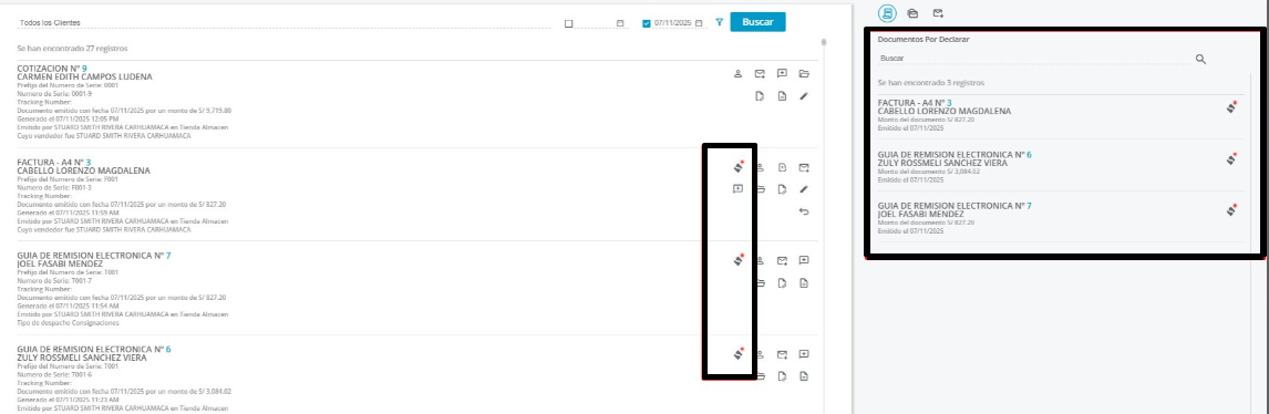 Si tienes Documentos Pendientes por Declarar los encontrarás en un listado ubicado al lado derecho de la pantalla, los puedes distinguir por su icono con el logo de SUNAT.
