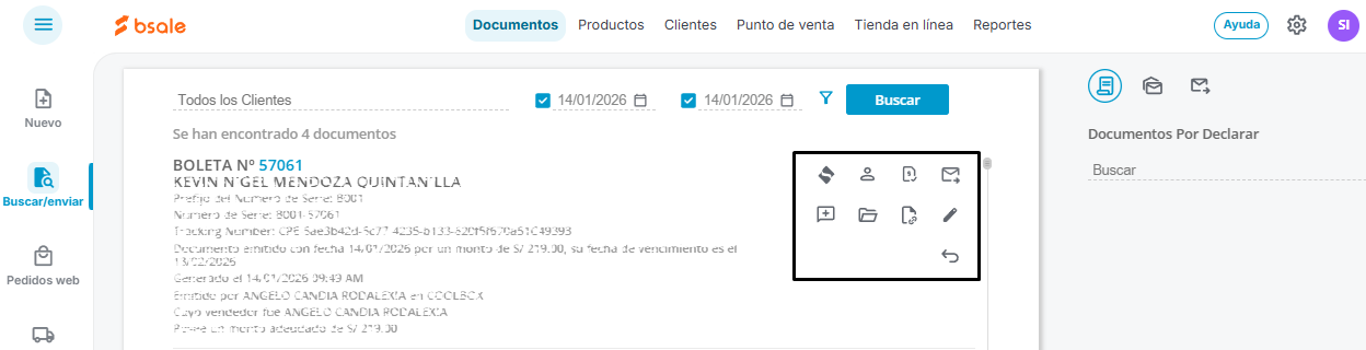 a) Todos los clientes: aquí puedes buscar los documentos emitidos por el nombre del cliente al que fueron asignados o bien por su número de RUC o DNI.