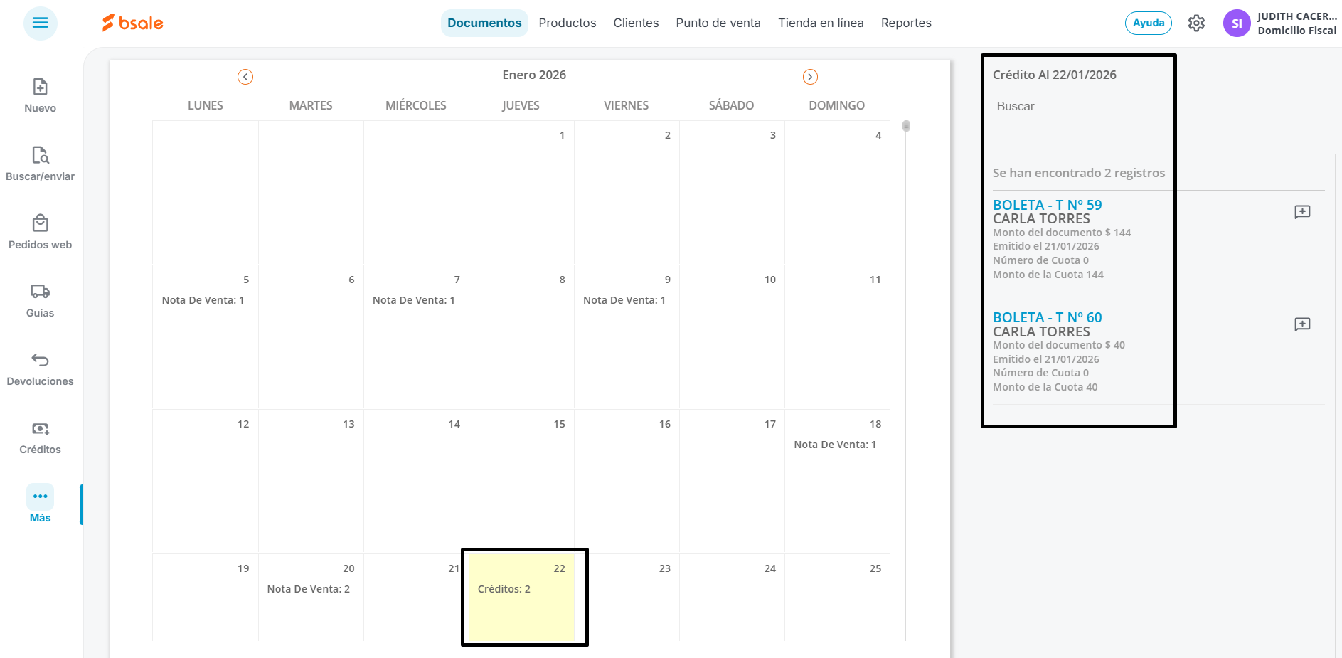 En el Calendario, se mostrarán las renovaciones pendientes de generar, documentos emitidos con fecha de vencimiento ( créditos) y podrás ver los documentos relacionados al hacer clic en el aviso marcado.