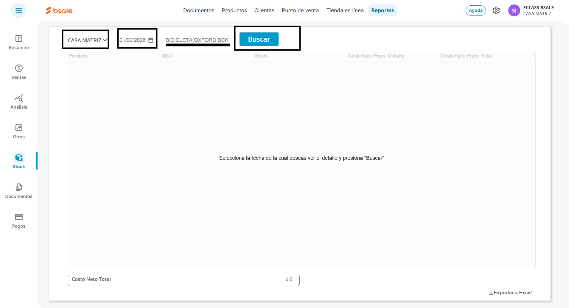 - Fecha: Escoge el día exacto del cual necesitas conocer el estado del stock.