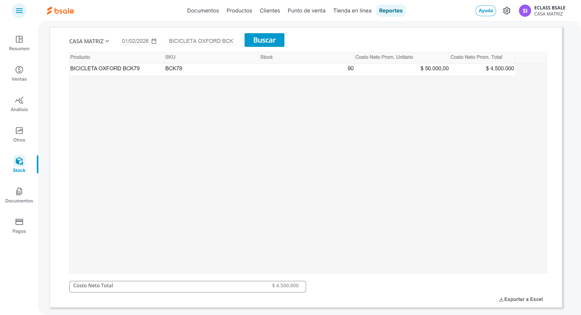 - Costo promedio total: El valor total del inventario para ese producto (Stock x Costo neto promedio).