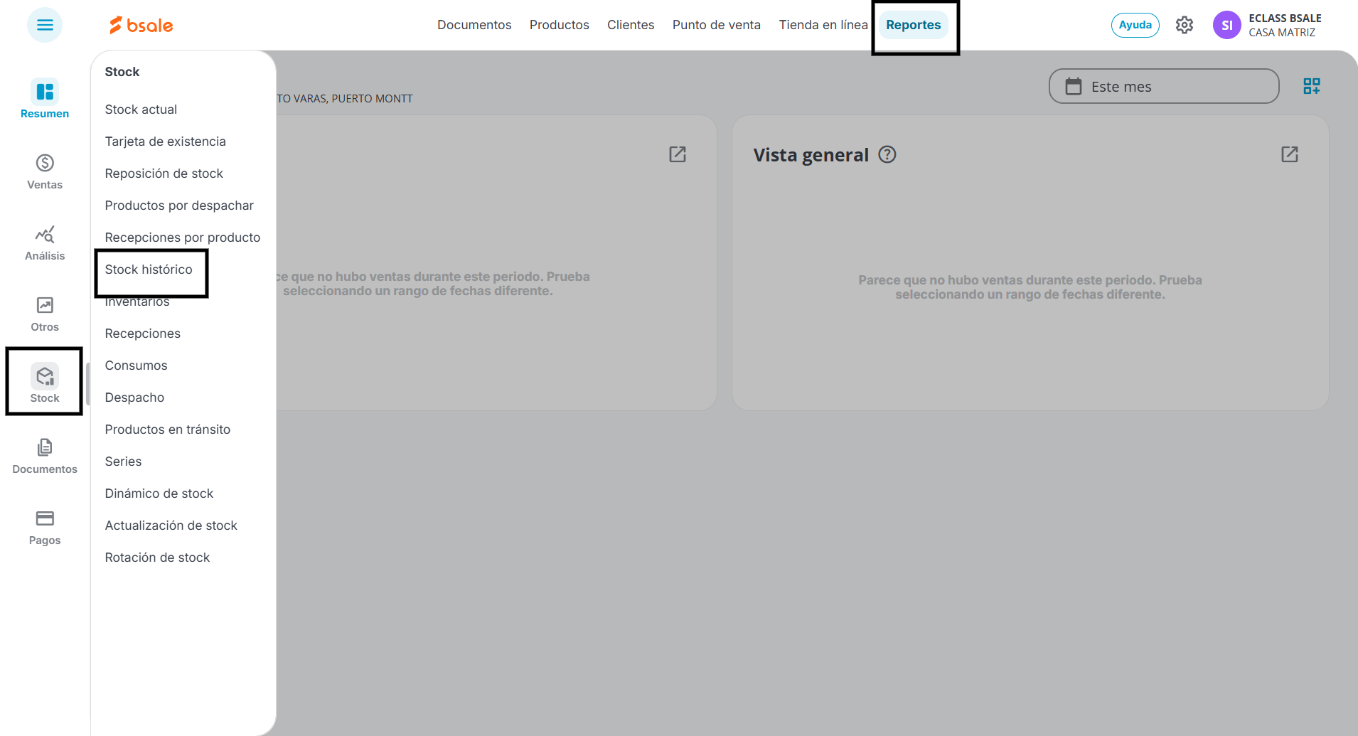 Para ver este reporte, primero pulsamos en Reportes, luego vamos al menú de Stock y finalmente seleccionamos Stock histórico.